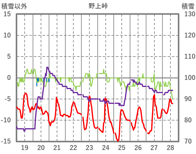 | 日 | 時 | 気温 | 降水 | 風向/風速 | 日照 | 積雪 | 降雪 |