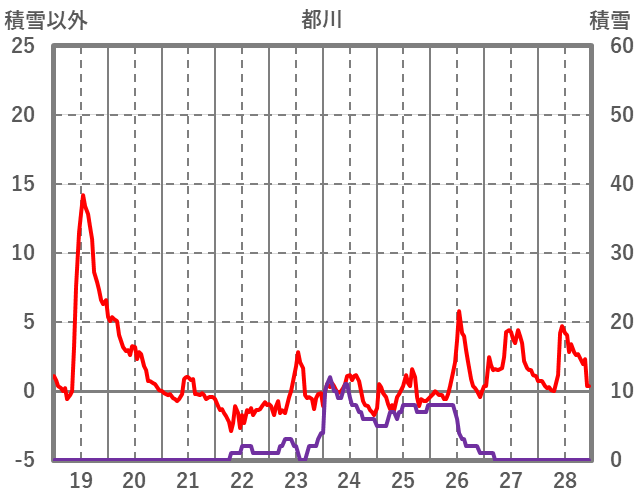 | 日 | 時 | 気温 | 降水 | 風向/風速 | 日照 | 積雪 | 降雪 |