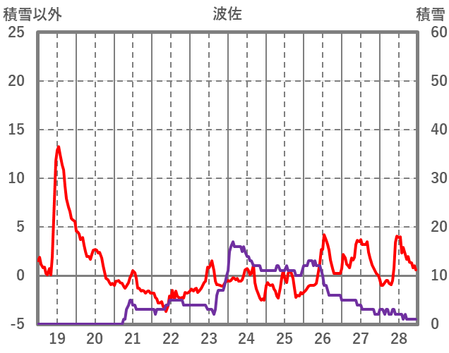 | 日 | 時 | 気温 | 降水 | 風向/風速 | 日照 | 積雪 | 降雪 |