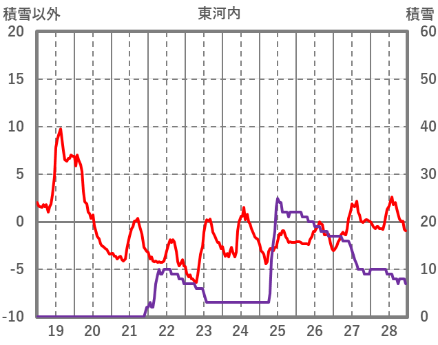 | 日 | 時 | 気温 | 降水 | 風向/風速 | 日照 | 積雪 | 降雪 |