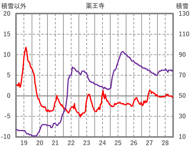 | 日 | 時 | 気温 | 降水 | 風向/風速 | 日照 | 積雪 | 降雪 |