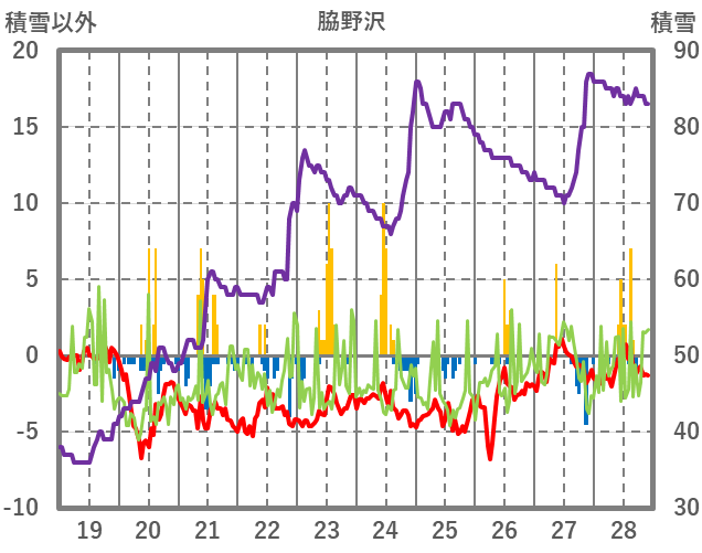 | 日 | 時 | 気温 | 降水 | 風向/風速 | 日照 | 積雪 | 降雪 |