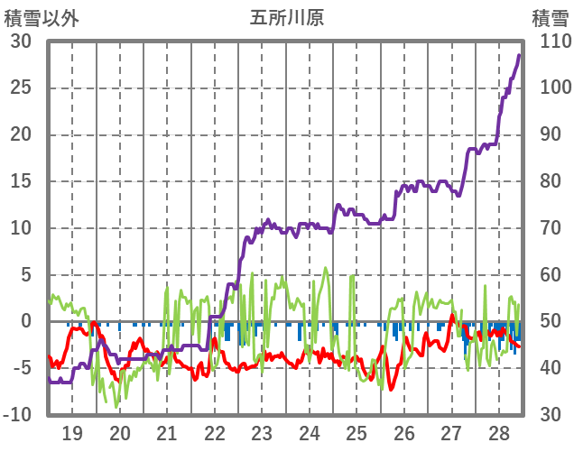 | 日 | 時 | 気温 | 降水 | 風向/風速 | 日照 | 積雪 | 降雪 |