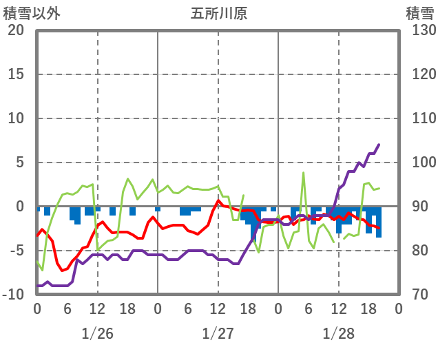 | 日 | 時 | 気温 | 降水 | 風向/風速 | 日照 | 積雪 | 降雪 |