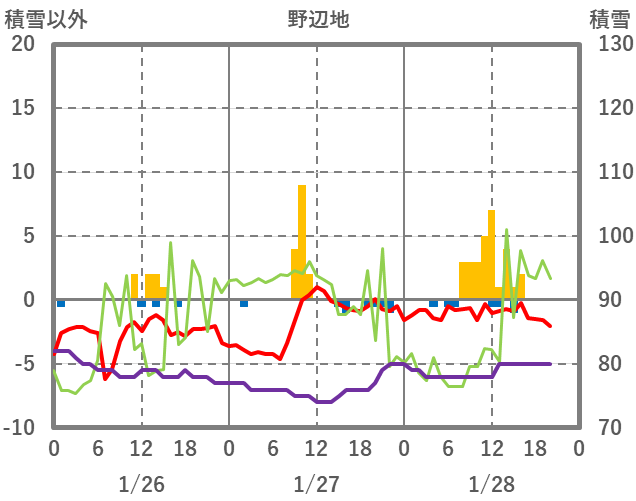 | 日 | 時 | 気温 | 降水 | 風向/風速 | 日照 | 積雪 | 降雪 |