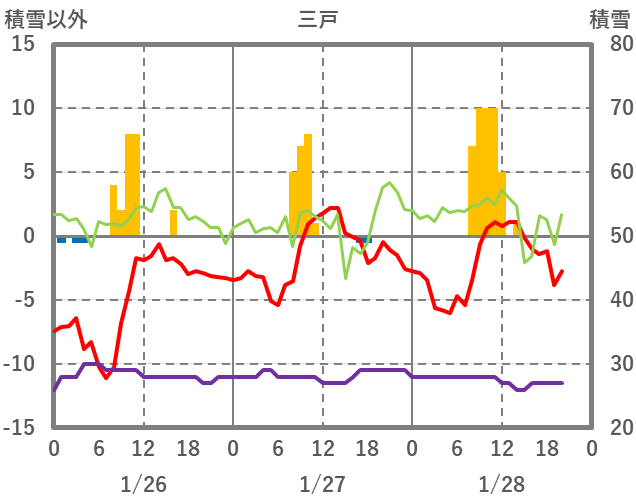 | 日 | 時 | 気温 | 降水 | 風向/風速 | 日照 | 積雪 | 降雪 |