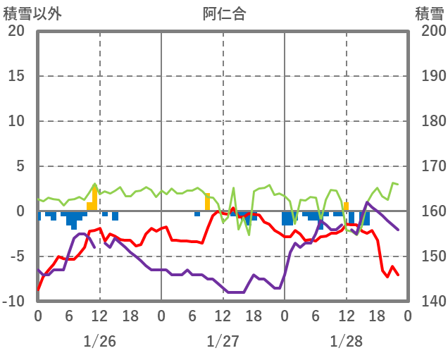 | 日 | 時 | 気温 | 降水 | 風向/風速 | 日照 | 積雪 | 降雪 |