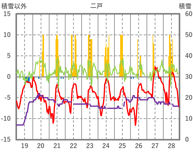 | 日 | 時 | 気温 | 降水 | 風向/風速 | 日照 | 積雪 | 降雪 |