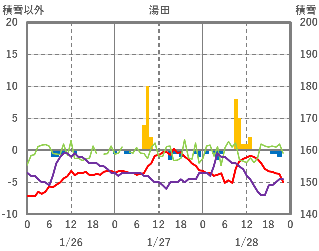 | 日 | 時 | 気温 | 降水 | 風向/風速 | 日照 | 積雪 | 降雪 |