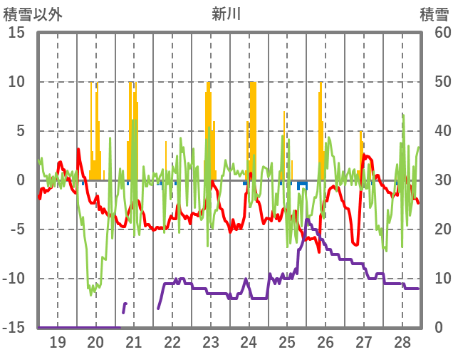 | 日 | 時 | 気温 | 降水 | 風向/風速 | 日照 | 積雪 | 降雪 |