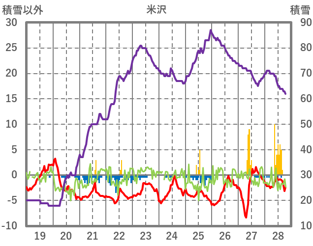 | 日 | 時 | 気温 | 降水 | 風向/風速 | 日照 | 積雪 | 降雪 |
