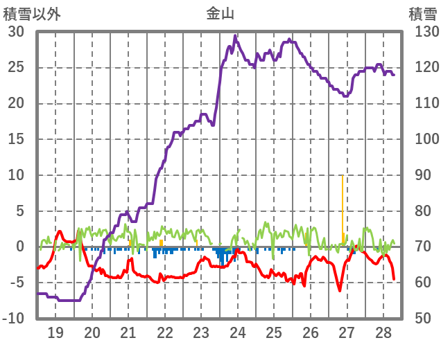 | 日 | 時 | 気温 | 降水 | 風向/風速 | 日照 | 積雪 | 降雪 |