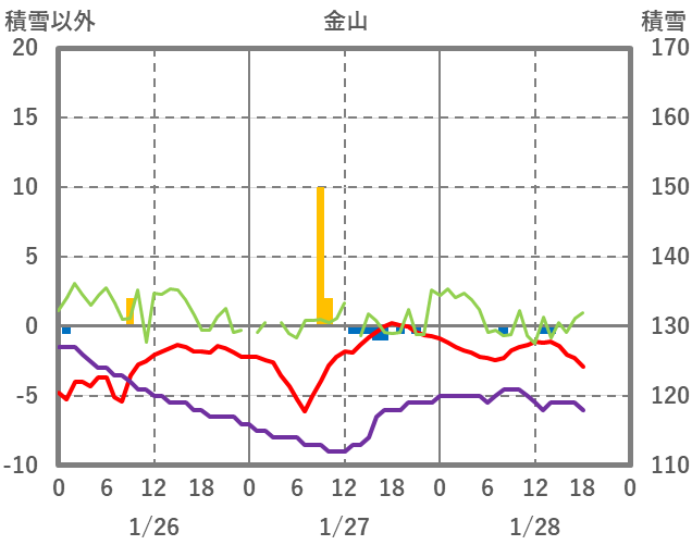 | 日 | 時 | 気温 | 降水 | 風向/風速 | 日照 | 積雪 | 降雪 |