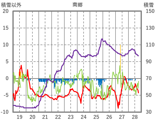 | 日 | 時 | 気温 | 降水 | 風向/風速 | 日照 | 積雪 | 降雪 |
