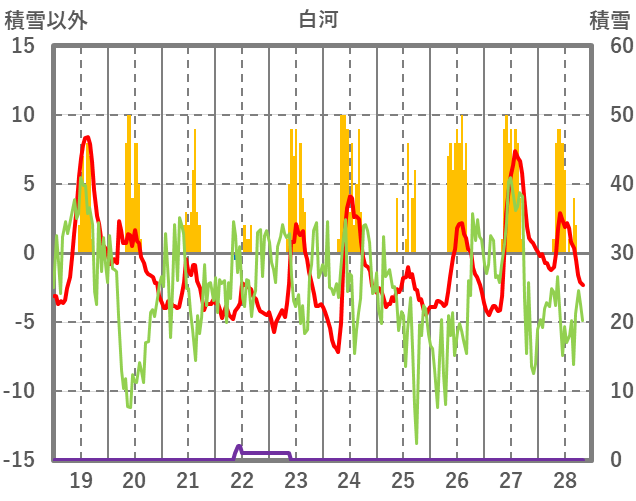 | 日 | 時 | 気温 | 降水 | 風向/風速 | 日照 | 積雪 | 降雪 |