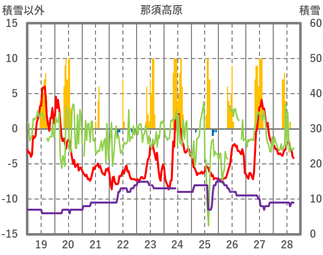 | 日 | 時 | 気温 | 降水 | 風向/風速 | 日照 | 積雪 | 降雪 |