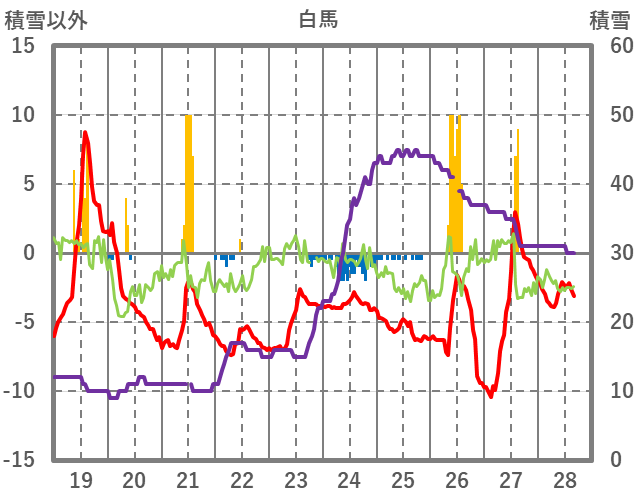 | 日 | 時 | 気温 | 降水 | 風向/風速 | 日照 | 積雪 | 降雪 |