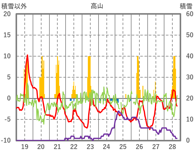 | 日 | 時 | 気温 | 降水 | 風向/風速 | 日照 | 積雪 | 降雪 |