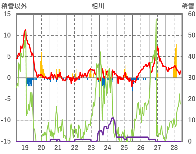 | 日 | 時 | 気温 | 降水 | 風向/風速 | 日照 | 積雪 | 降雪 |