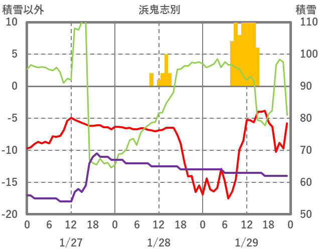 | 日 | 時 | 気温 | 降水 | 風向/風速 | 日照 | 積雪 | 降雪 |
