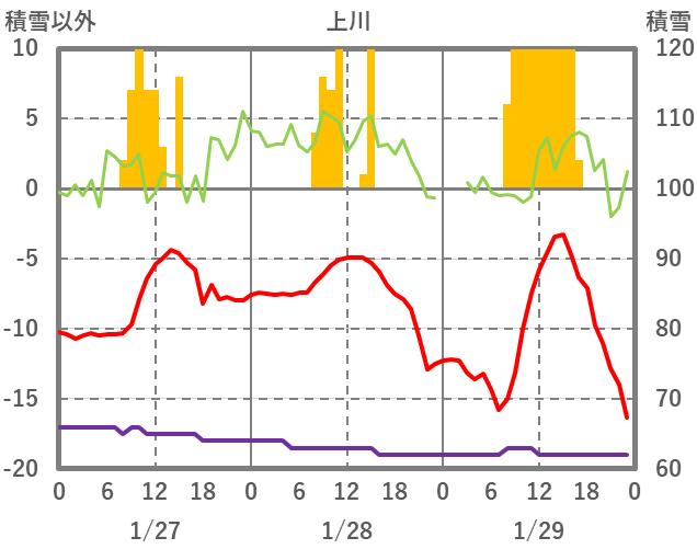 | 日 | 時 | 気温 | 降水 | 風向/風速 | 日照 | 積雪 | 降雪 |
