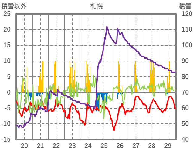 | 日 | 時 | 気温 | 降水 | 風向/風速 | 日照 | 積雪 | 降雪 |