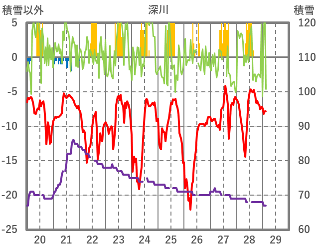 | 日 | 時 | 気温 | 降水 | 風向/風速 | 日照 | 積雪 | 降雪 |