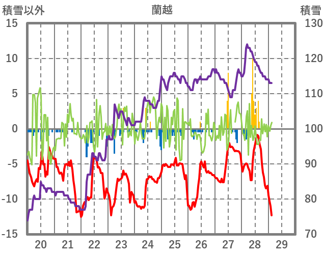 | 日 | 時 | 気温 | 降水 | 風向/風速 | 日照 | 積雪 | 降雪 |