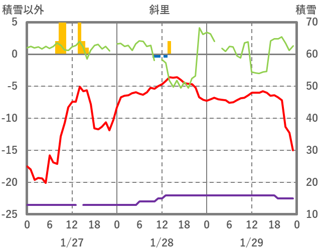 | 日 | 時 | 気温 | 降水 | 風向/風速 | 日照 | 積雪 | 降雪 |