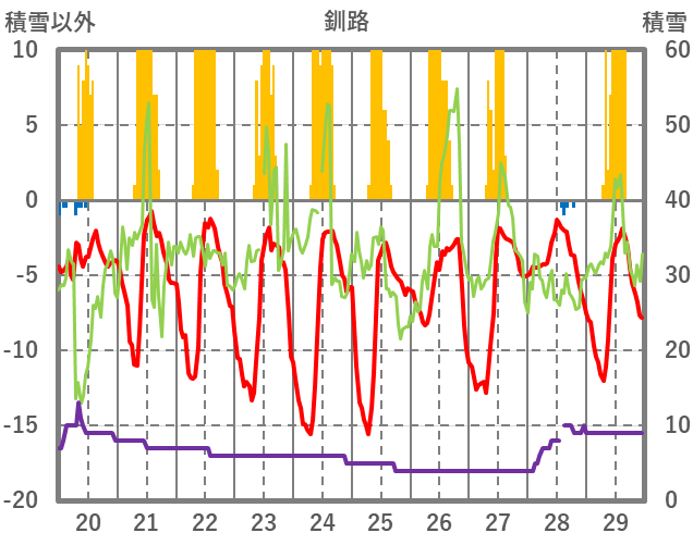 | 日 | 時 | 気温 | 降水 | 風向/風速 | 日照 | 積雪 | 降雪 |