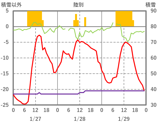 | 日 | 時 | 気温 | 降水 | 風向/風速 | 日照 | 積雪 | 降雪 |