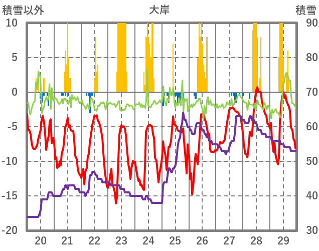 | 日 | 時 | 気温 | 降水 | 風向/風速 | 日照 | 積雪 | 降雪 |