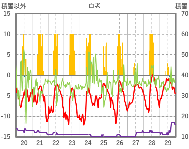 | 日 | 時 | 気温 | 降水 | 風向/風速 | 日照 | 積雪 | 降雪 |