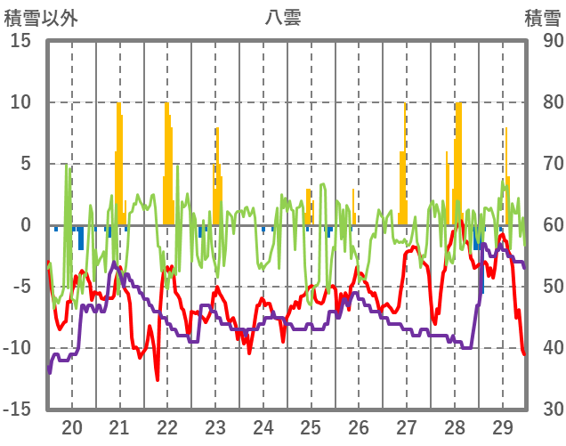 | 日 | 時 | 気温 | 降水 | 風向/風速 | 日照 | 積雪 | 降雪 |
