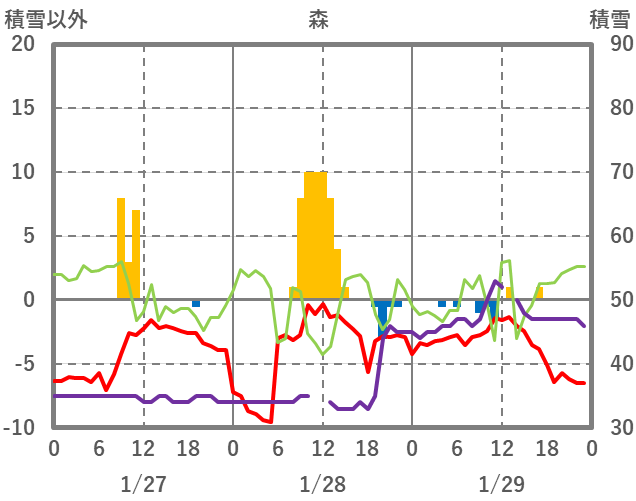 | 日 | 時 | 気温 | 降水 | 風向/風速 | 日照 | 積雪 | 降雪 |