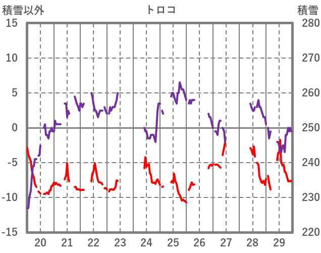 | 日 | 時 | 気温 | 降水 | 風向/風速 | 日照 | 積雪 | 降雪 |