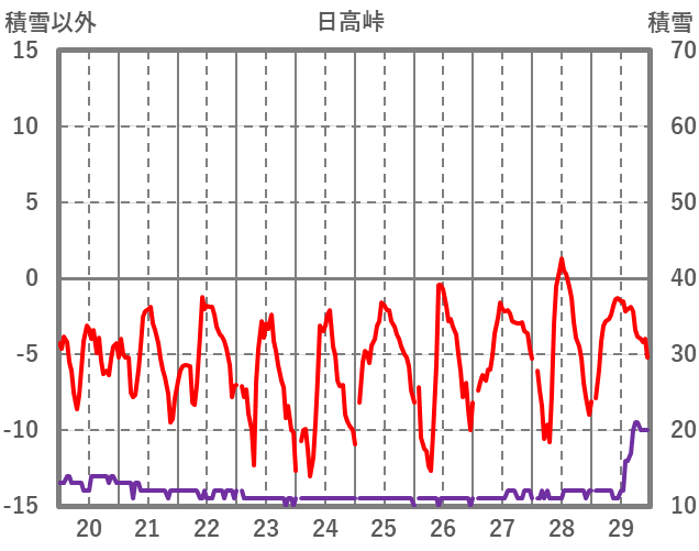 | 日 | 時 | 気温 | 降水 | 風向/風速 | 日照 | 積雪 | 降雪 |