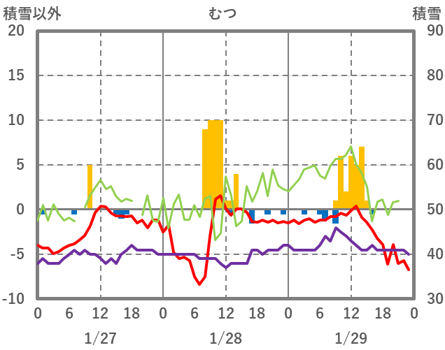 | 日 | 時 | 気温 | 降水 | 風向/風速 | 日照 | 積雪 | 降雪 |