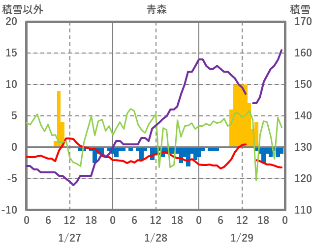 | 日 | 時 | 気温 | 降水 | 風向/風速 | 日照 | 積雪 | 降雪 |