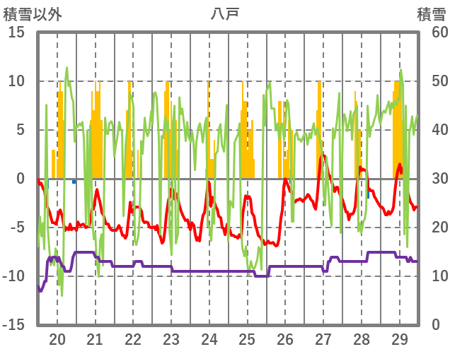 | 日 | 時 | 気温 | 降水 | 風向/風速 | 日照 | 積雪 | 降雪 |