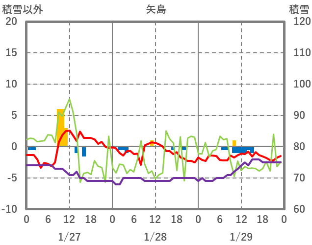 | 日 | 時 | 気温 | 降水 | 風向/風速 | 日照 | 積雪 | 降雪 |