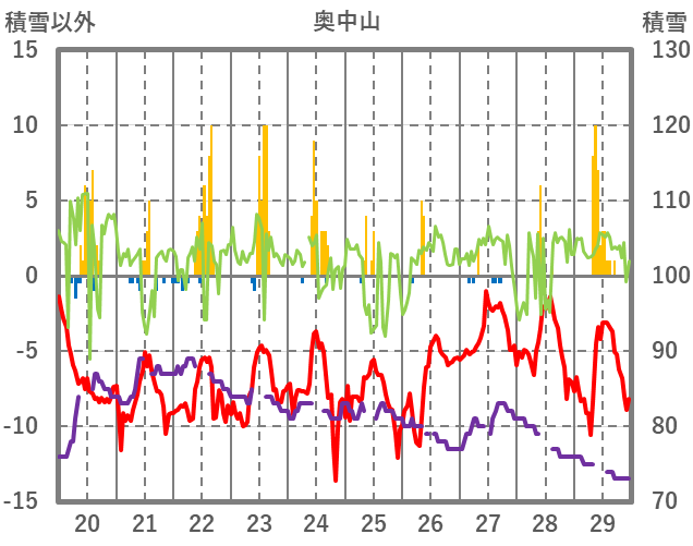 | 日 | 時 | 気温 | 降水 | 風向/風速 | 日照 | 積雪 | 降雪 |