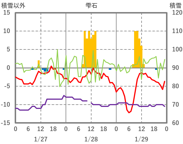 | 日 | 時 | 気温 | 降水 | 風向/風速 | 日照 | 積雪 | 降雪 |