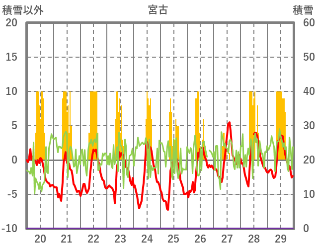 | 日 | 時 | 気温 | 降水 | 風向/風速 | 日照 | 積雪 | 降雪 |