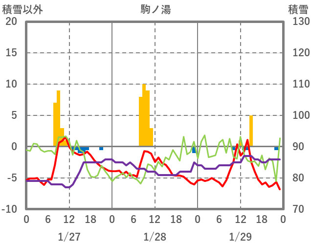 | 日 | 時 | 気温 | 降水 | 風向/風速 | 日照 | 積雪 | 降雪 |