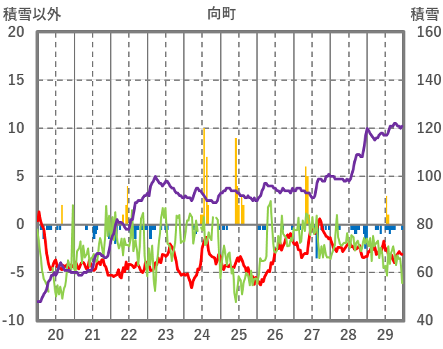 | 日 | 時 | 気温 | 降水 | 風向/風速 | 日照 | 積雪 | 降雪 |