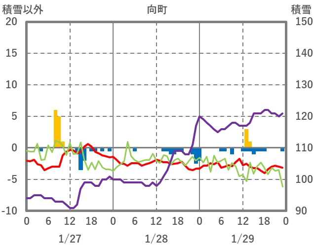 | 日 | 時 | 気温 | 降水 | 風向/風速 | 日照 | 積雪 | 降雪 |