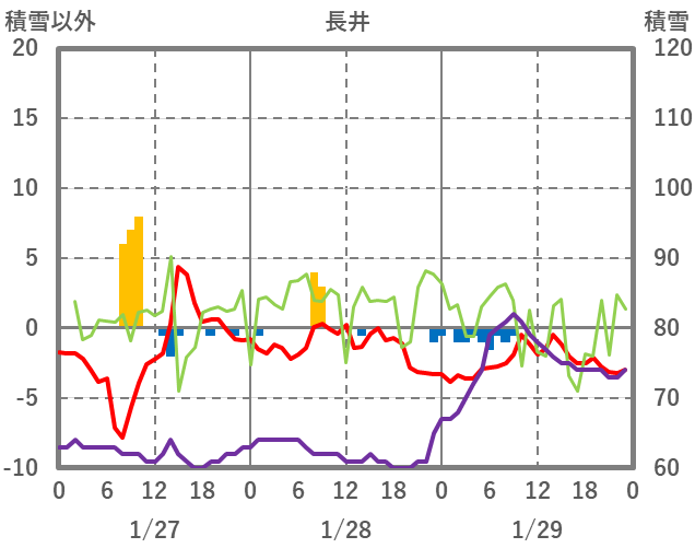 | 日 | 時 | 気温 | 降水 | 風向/風速 | 日照 | 積雪 | 降雪 |