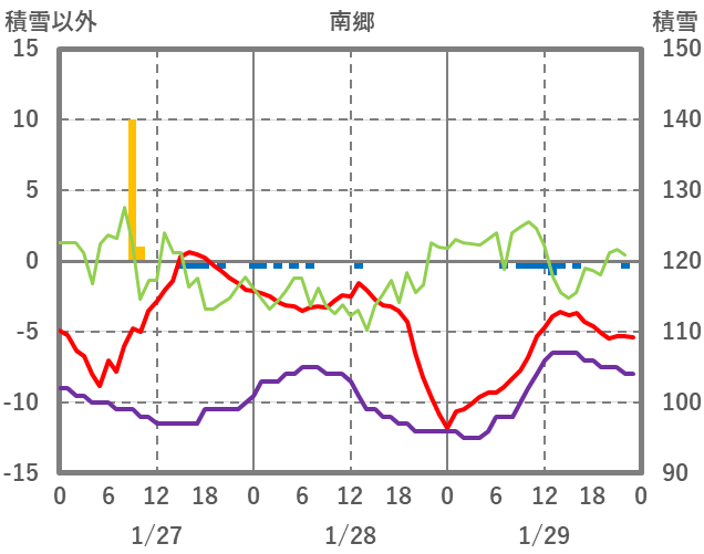 | 日 | 時 | 気温 | 降水 | 風向/風速 | 日照 | 積雪 | 降雪 |