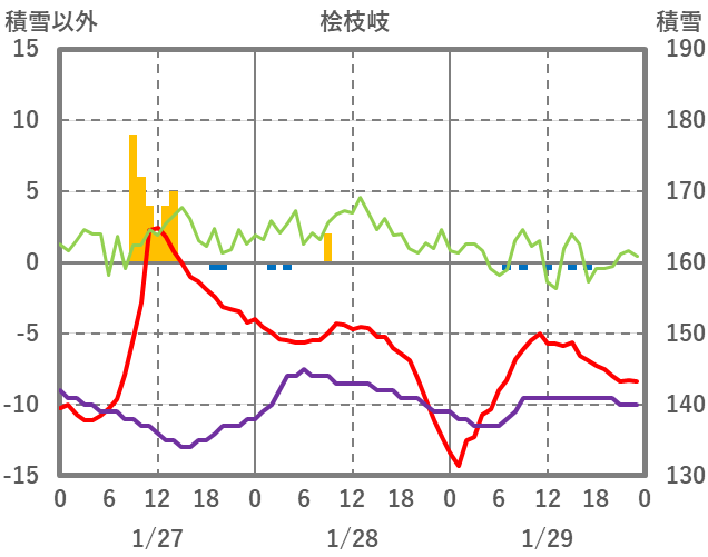 | 日 | 時 | 気温 | 降水 | 風向/風速 | 日照 | 積雪 | 降雪 |